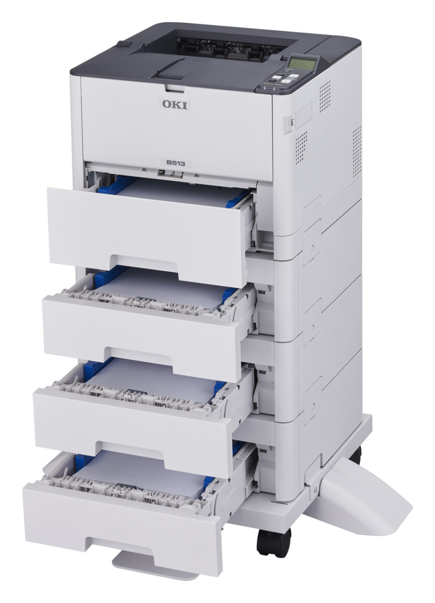 Model B513 zapewnia wydruk pierwszej strony w zaledwie 4,1 sekundy, prędkość do 45 stron na minutę oraz możliwość rozbudowy podajników do 2220 arkuszy. Dzięki temu urządzenia sprawdzają się w środowiskach o dużym natężeniu druku.